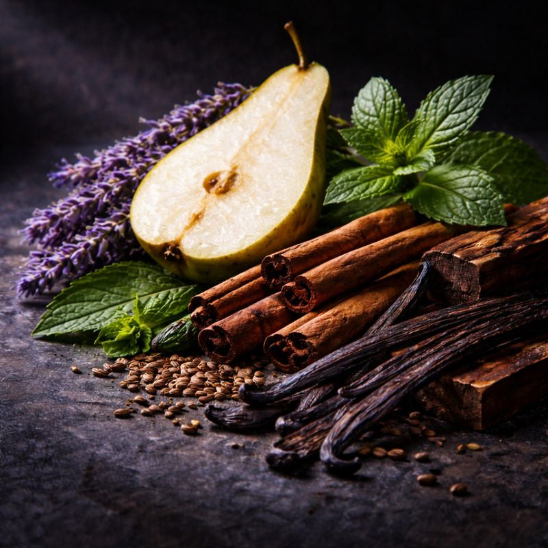 A loud, modern gourmand fougère combining juicy pear sweetness with aromatic freshness and a dark vanilla base. Built for high projection and contemporary masculine or unisex perfume lines.